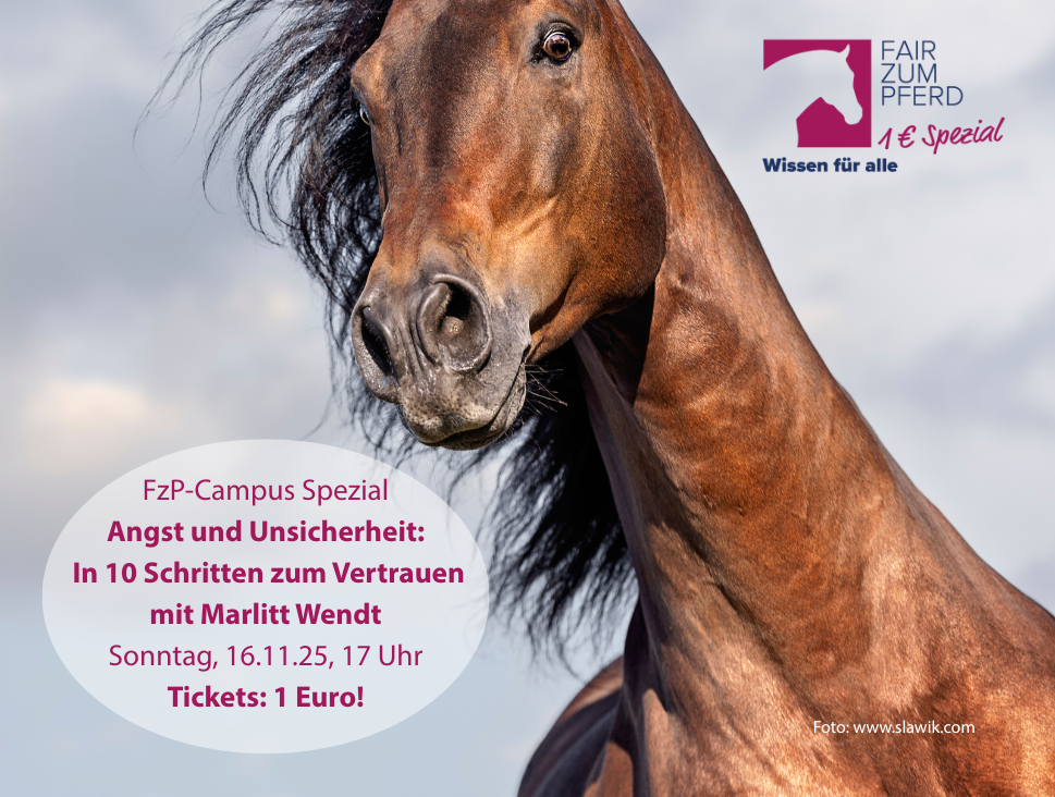 Die Idee hinter unserem „FzP-Campus Spezial: Wissen für alle“: Die Tickets dazu kosten nur einen Euro, sind also für jeden erschwinglich. In Zukunft möchten wir einmal im Jahr einen FzP-Campus Spezial anbieten. Wir wollen fundiertes Wissen rund ums Pferd für möglichst viele zugänglich machen. Die Grundlagen pferdegerechten Handelns sollten kein Luxus sein – darum kostet jedes Ticket nur einen Euro.